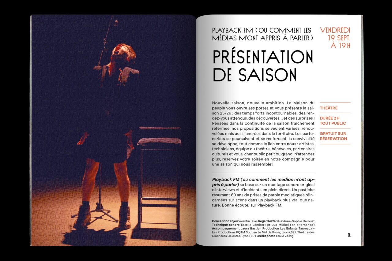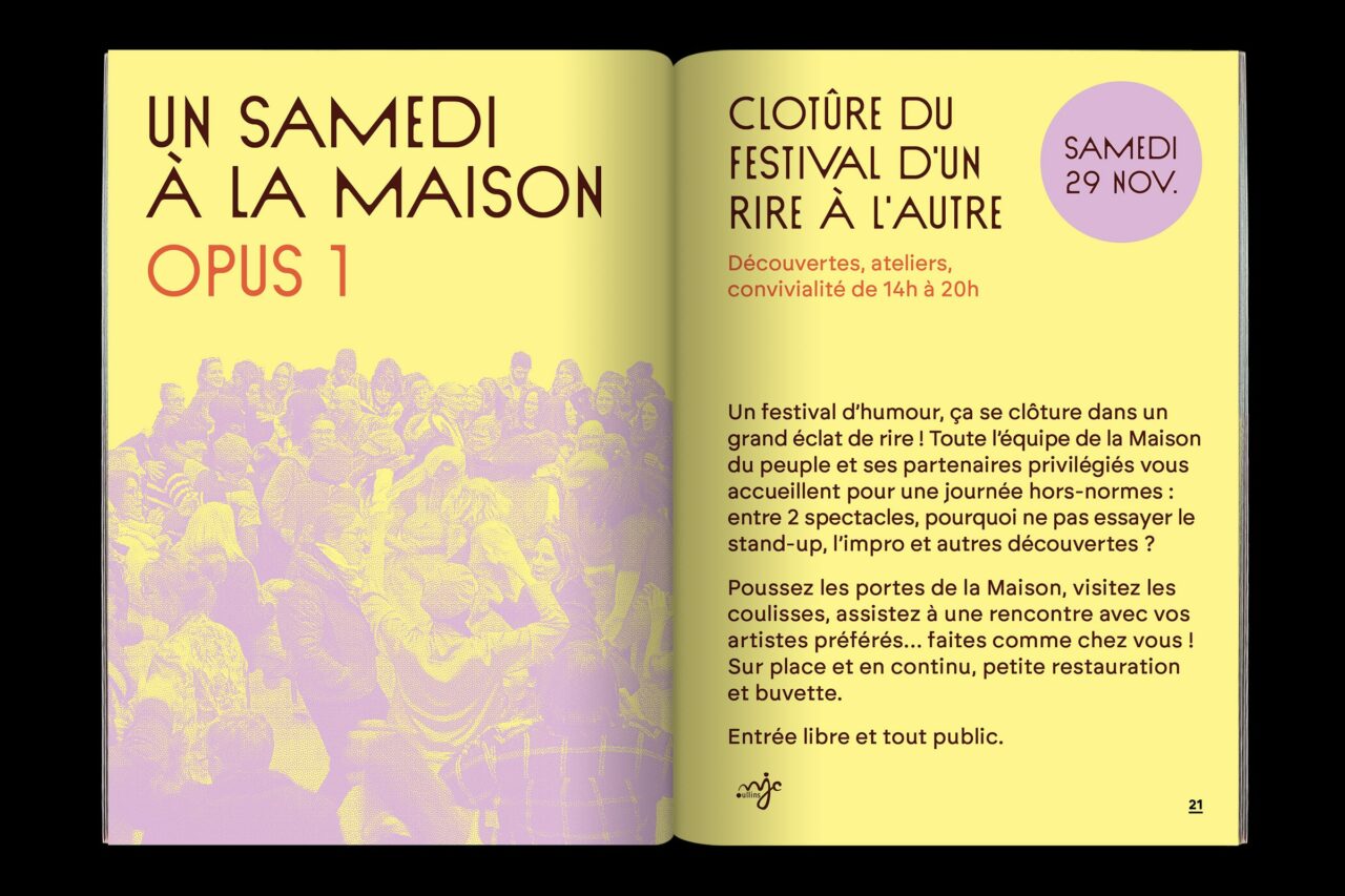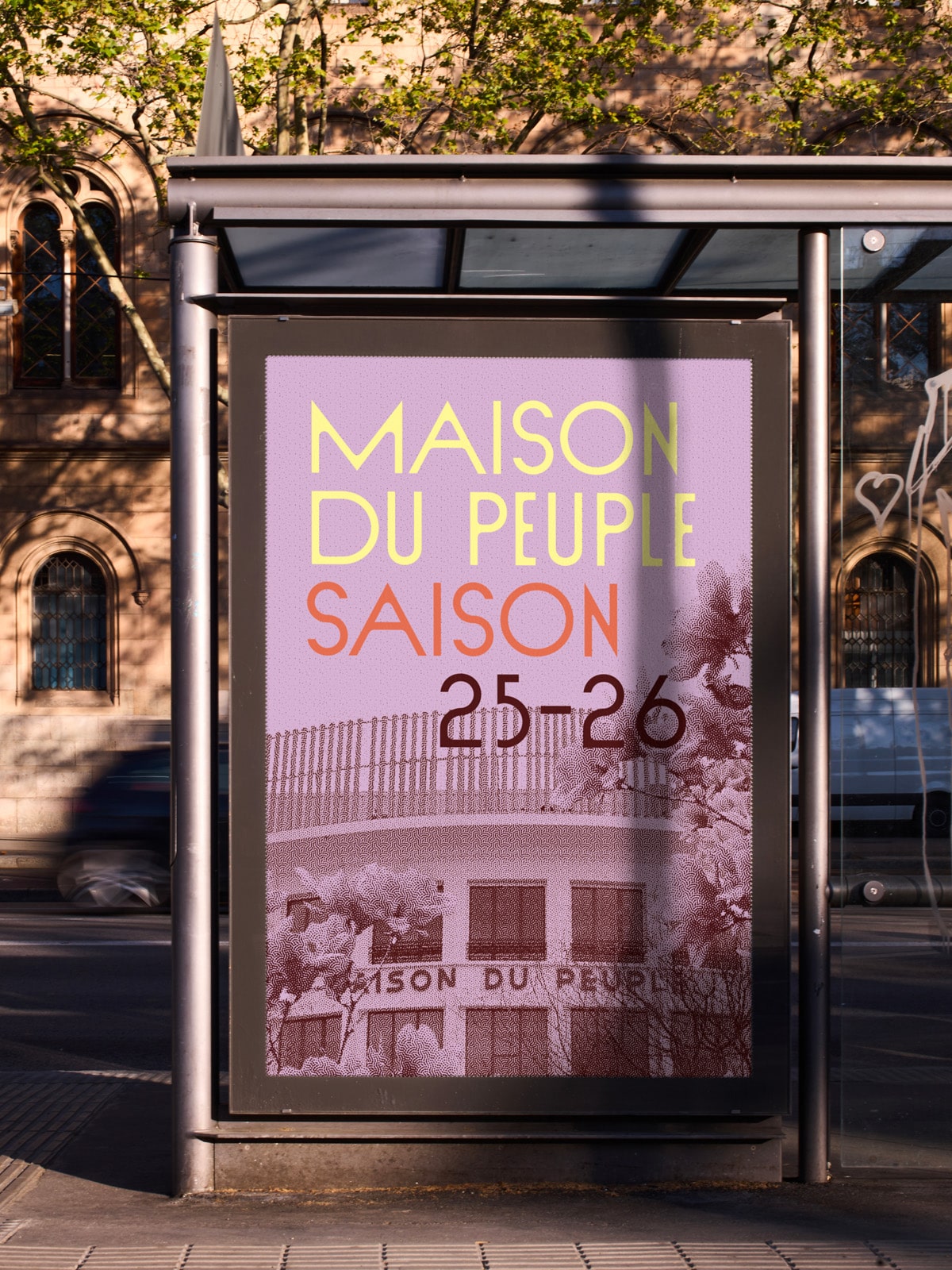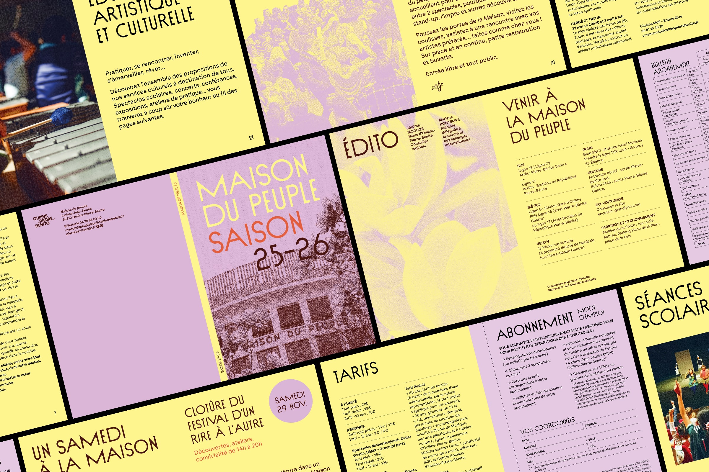 Pour la deuxième année consécutive, nous réalisons l’identité de la Maison du Peuple — théâtre d’Oullins-Pierre-Bénite. Une identié avec une typographie rythmée et des couleurs vibrantes pour dévoiler la programmation culturelle du théâtre.